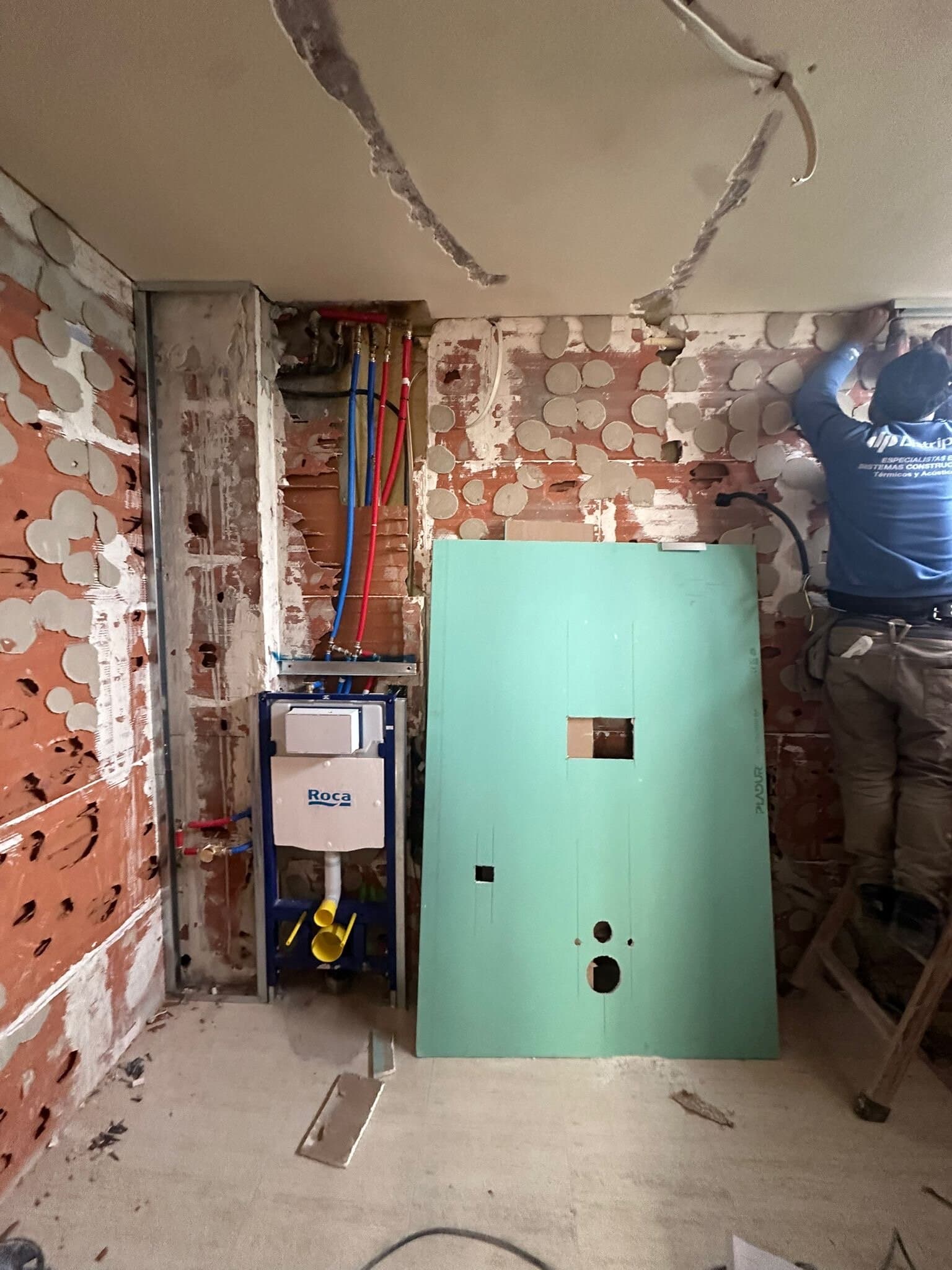 Durante la ejecución, prestamos especial atención a la impermeabilización de la zona húmeda, un paso crucial al instalar platos de ducha a ras de suelo. Nivelamos el pavimento para asegurar una caída de agua perfecta y preparamos las paredes para recibir los nuevos revestimientos. La instalación de la nueva fontanería empotrada requirió precisión milimétrica, ya que al ir integrada en la pared, no hay margen de error. Fue un proceso meticuloso donde cada detalle contaba para lograr ese acabado de revista.