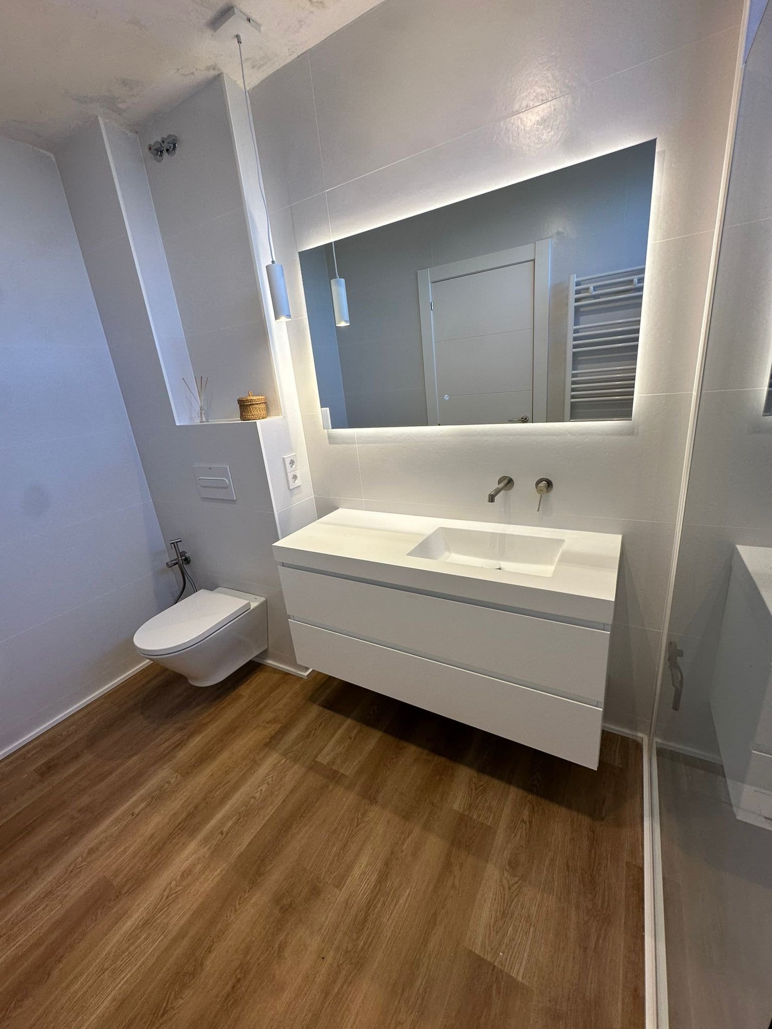 Los propietarios de esta vivienda sentían que su cuarto de baño se había quedado atrapado en el tiempo. A pesar de tener metros cuadrados suficientes, la estancia se sentía pesada y oscura, dominada por un revestimiento de mármol beige antiguo y una bañera que ya no respondía a su ritmo de vida actual. Buscaban una empresa de reformas de confianza que pudiera interpretar su necesidad: ganar espacio visual, mejorar la funcionalidad y, sobre todo, traer luz.