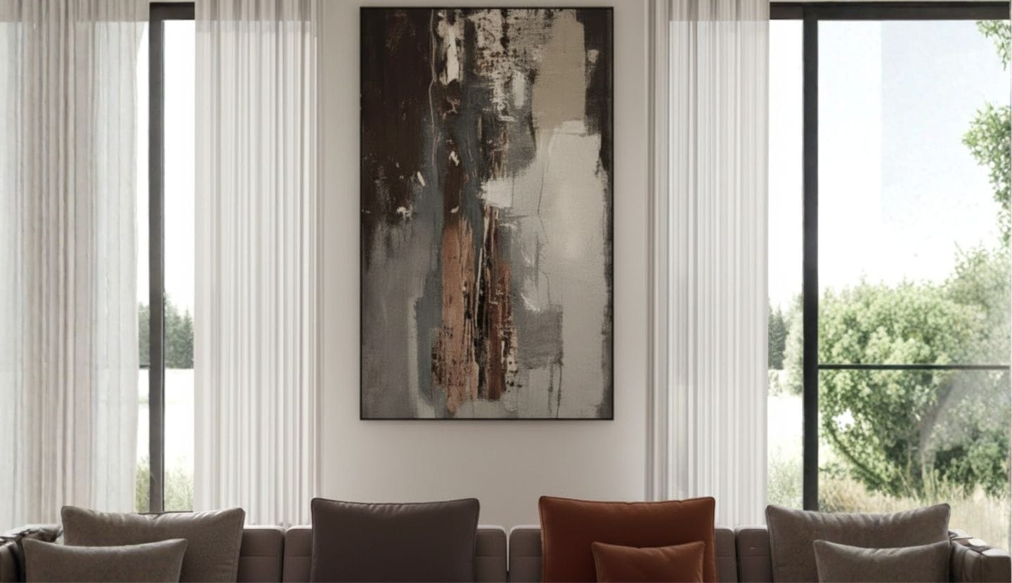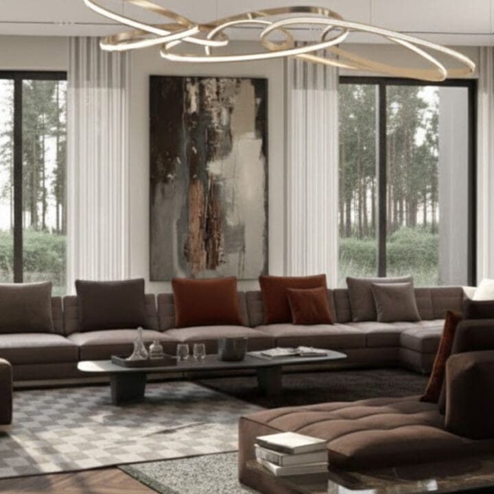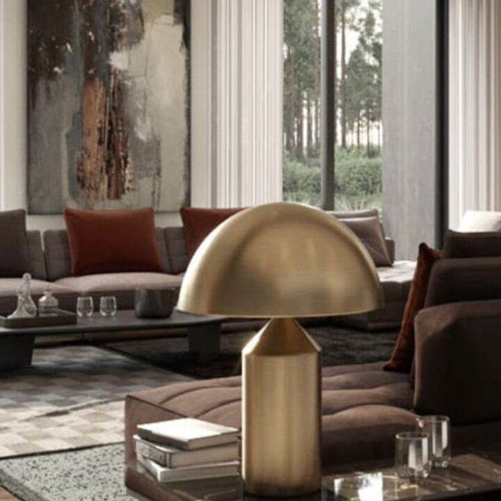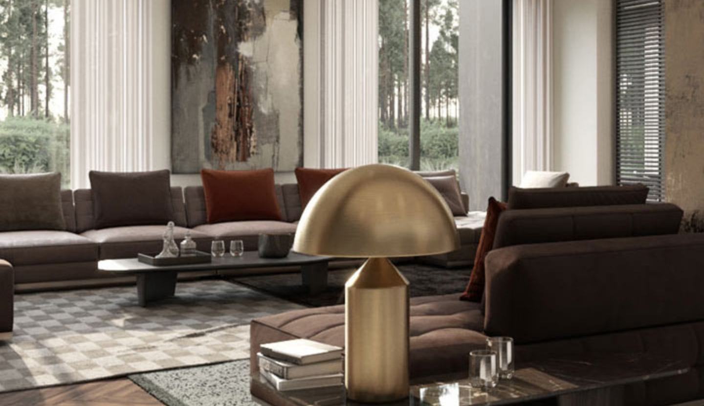 Mobiliario escultural: Se seleccionaron sofás modulares de tonos tierra y una mesa auxiliar de mármol que ancla la composición, complementados con una lámpara de sobremesa en latón que actúa como joya visual.