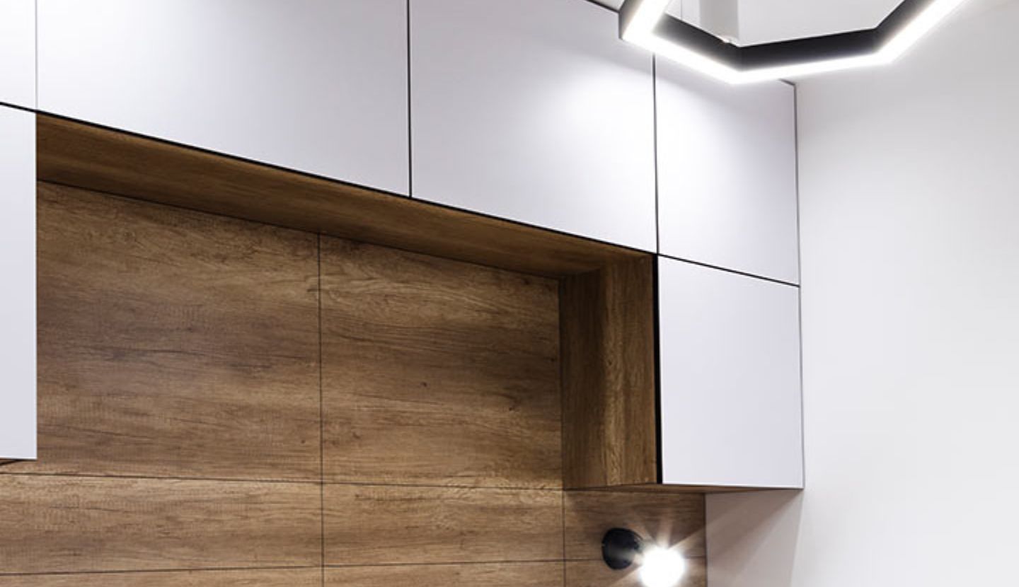 Mobiliario integrado: Se diseñó un puente de armarios minimalistas en blanco mate que liberan el suelo, creando un nicho central revestido en madera para aportar profundidad.