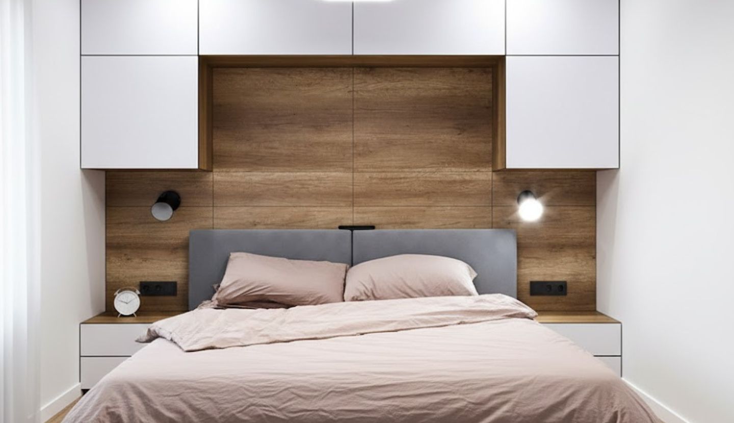 El cliente tenía una visión clara: el blanco puro y la madera natural debían ser el hilo conductor. El reto técnico radicaba en diseñar un sistema de mobiliario aéreo que enmarcara la cama de forma ergonómica, logrando que los módulos superiores se sintieran ligeros visualmente mientras ofrecían una solución real a la falta de armarios en la vivienda.