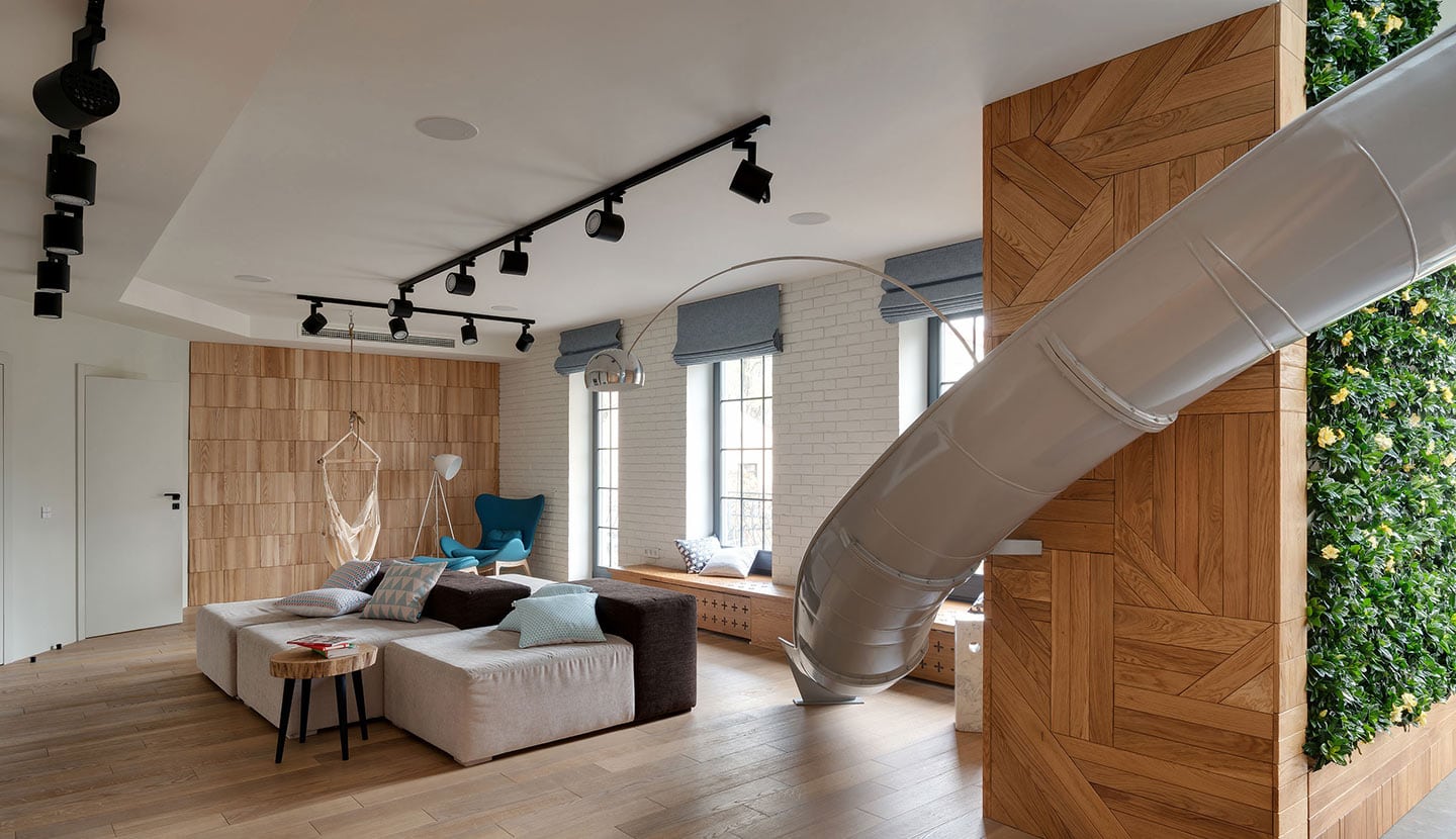 El salón lúdico: Es el corazón de la vivienda. Rompimos con lo tradicional instalando un tobogán interior que conecta niveles y define el carácter desenfadado del espacio, complementado con zonas de relax modulares y una hamaca.